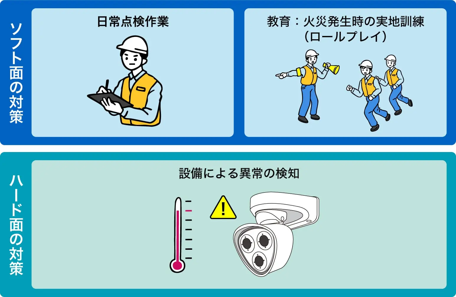 このように、人の判断と教育、そして設備による“見える化”の両輪でリスクに備える体制こそが、火災予防を実効性あるものへと変えていきます。複数の対策が連携し、補完し合うことで、火災という最悪の事態を未然に防ぐ“現場の総合力”が育まれていくのです。