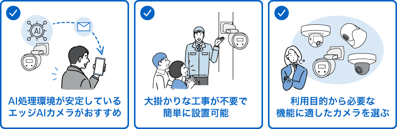 さまざまな分析ができるエッジAIカメラですが、選ぶ際には用途に合うものを選ぶことがポイントです。製品によって機能は異なるため、利用の目的を明確にしてから、必要な機能とともにより適したカメラを選びましょう。導入においては、コスト面の比較も外せません。エッジAIカメラはサーバー型のAIカメラと比較して初期費用がかかりやすい難点がありますが、長期的に見るとコスト削減につながることが期待できます。